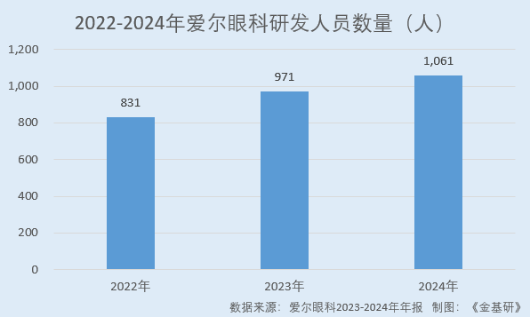 2022-2024年,爱尔眼科研发人员数量分别为831人、971人、1,061人,呈逐年增长趋势。