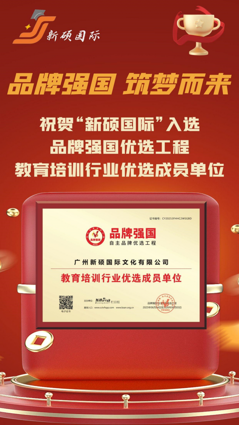 近日,广州新硕国际文化有限公司凭借在成人在职考研教育领域的卓越表现,成功入选 “品牌强国自主品牌优选工程”,被评定为教育培训行业优选成员单位。