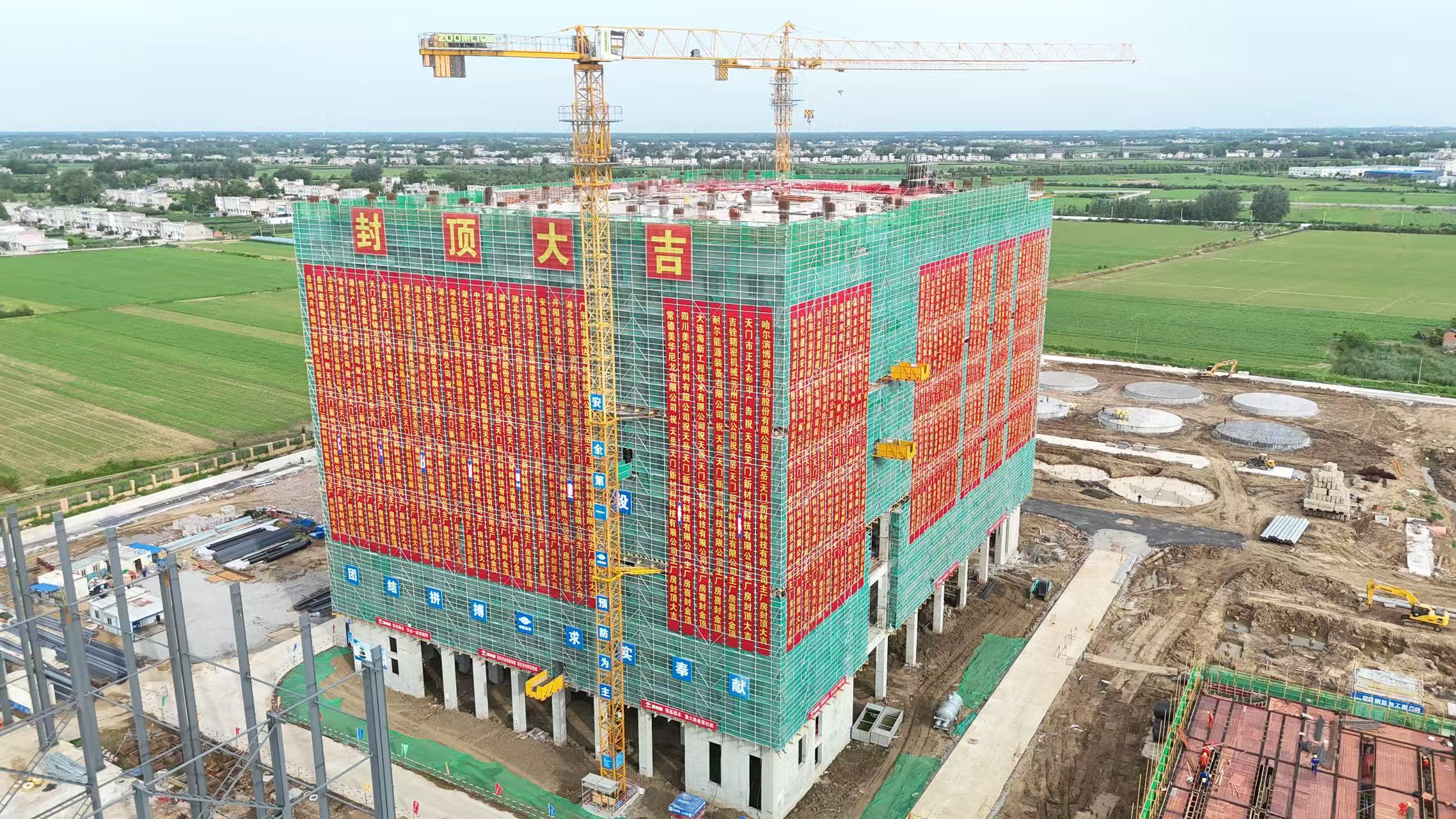 该聚合厂房主体7层局部9层,建筑高度65.7米,框架剪力墙结构,占地面积4085.64㎡,建筑面积30693.09㎡。自2024年12月12日基础动土开挖以来,项目部采用标准化作业与先进工艺技术,克服高支模危大工程等施工难点,以“11.5天/层”的施工速度推进建设,最终提前4天完成封顶任务,刷新同类化工厂房建设效率纪录,获业主方高度认可。