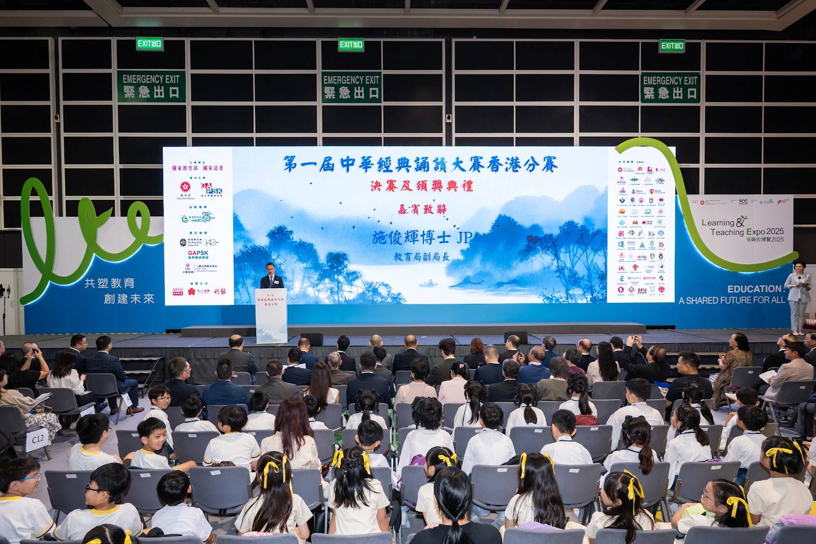 本次大会同时也荣幸邀请到香港特区政府教育局副局长施俊辉先生、香港中联办教育科技部一级巡视员刘懋洲先生、外交部驻港特派员公署国际组织部主任王剑参赞担任主礼嘉宾。施副局长在开场致辞时表示,教育局一直致力培养学生的普通话能力,也十分重视推动中华文化的学习与传承,透过多元策略,从课程、学与教资源、学生活动、教师专业发展各方面,帮助学生学好普通话,认识和欣赏中华文化。他期许同学能在琅琅书声里,与经典相伴,从植根于语言文字的传统文化当中,汲取智慧与力量,成为厚植家国情怀、拥有全球视野的未来人才。