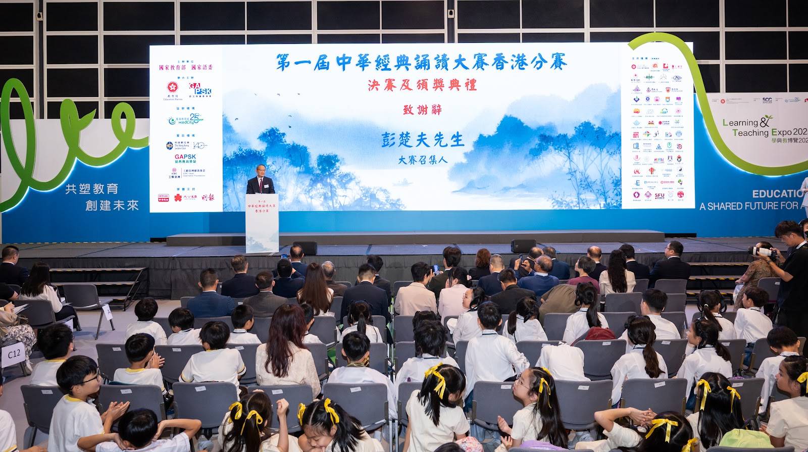 第一届中华经典诵读大赛香港分赛召集人彭楚夫先生在致谢辞中表示,作为一项国家级赛事,全国每年有多达四千支队伍参赛,具有极高的权威性和挑战性。今年首次在香港举办分赛,由香港特区教育局与GAPSK语文推广委员会联合主办,共有160支队伍参赛。胜出队伍将代表香港参加今年八月下旬在重庆举行的全国总决赛。今年亦适逢GAPSK语文推广委员成立20周年及展演会10周年,委员会将继续透过不同平台和活动,协助港澳学生深入理解中华经典文学,提升价值观及普通话水平。他特别感谢国家教育部及国家语委的指导支持,以及约50家支持机构的鼎力相助,期望透过是次大赛让更多人感受中华文化经典的魅力,让传统文化在香港深植根基,代代相传。