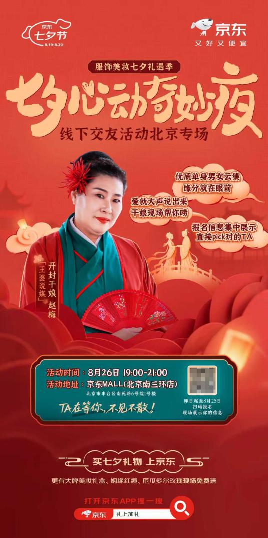 8月26日19:00,京东服饰美妆还联合京东MALL,将携手网络爆火的开封交友栏目《王婆说媒》主持人赵梅,在京东MALL北京南三环店打造“心动奇妙夜”线下交友专场,助力广大单身青年邂逅佳偶良缘。