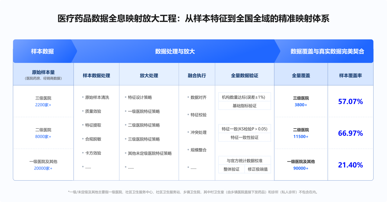 1. 样本覆盖全面性:整合医院药房和药品经销商数据(合规脱敏),样本覆盖全国各级医院,涵盖2200+家三级医院、8000+家二级医院及20000+家一级/未定级/其他医院。经过样本数据处理(包括原始样本清洗、质量效验、特征提取等)、放大处理(采用特征设计策略、一/二/三级医院特征策略等)、融合执行(数据对齐、特征校验、冲突处理等)、全量数据验证(机构数量达标,误差±1%;与官方统计数据校准)、最终覆盖率分别为57.07%,66.97%,21.40%,显著提升了数据代表性与模型可靠性,有效减少放大误差。