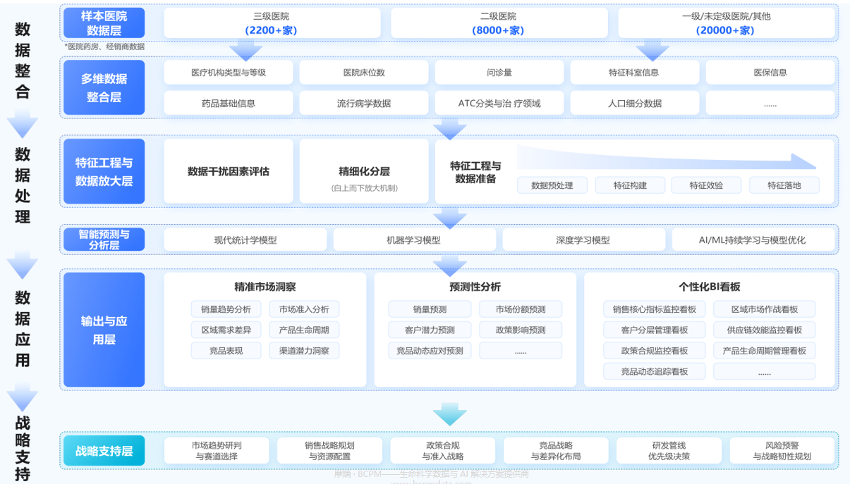 直面行业数据痛点,摩熵·院销智策应需而生。「摩熵·院销智策」——首款精细至全国各省、市、区县及医院等级维度的院内药品销售数据分析系统。系统依托2200+家三级医院、8000+家二级医院及20000+家一级/未定级/其他医院的样本数据,整合医疗机构类型与等级、医院床位数、特征科室信息、问诊量、药品基础信息、国家和省级集中采购信息、流行病学等多维度外部数据,通过现代统计学与机器学习算法深度建模,实现数据的科学放大与还原,精准推导全国医院药品销售真实图景。【*整合医院药房和药品经销商数据(合规脱敏)】