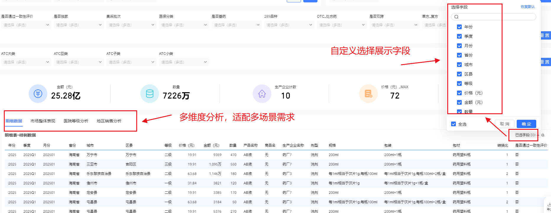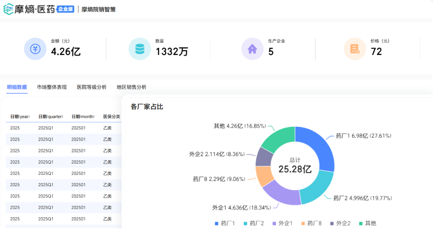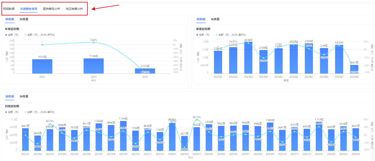 丰富的数据分析维度:包含明细数据、市场整体表现、医院等级分析、地区销售详解,全方位助力企业把握市场脉搏、洞悉竞争态势、优化区域布局,实现精细化运营。
