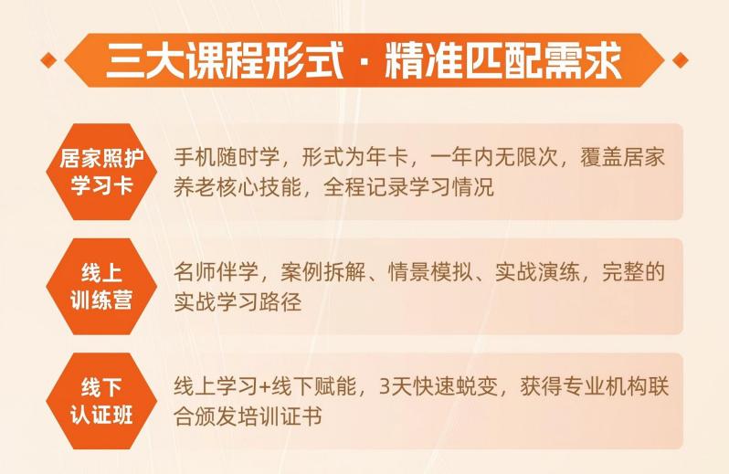 1、 居家照护学习卡:一台手机、一个账号、一套赋能体系课程,灵活安排学习时间。