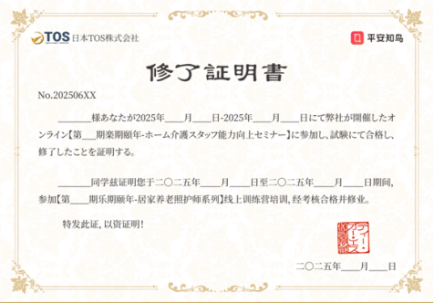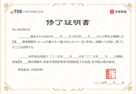 考核合格后获得平安知鸟与日本知名的多元化运营养老机构TOS股份有限公司联合授证,助力学员拓宽职业发展路径,增强在养老服务领域职业自信。