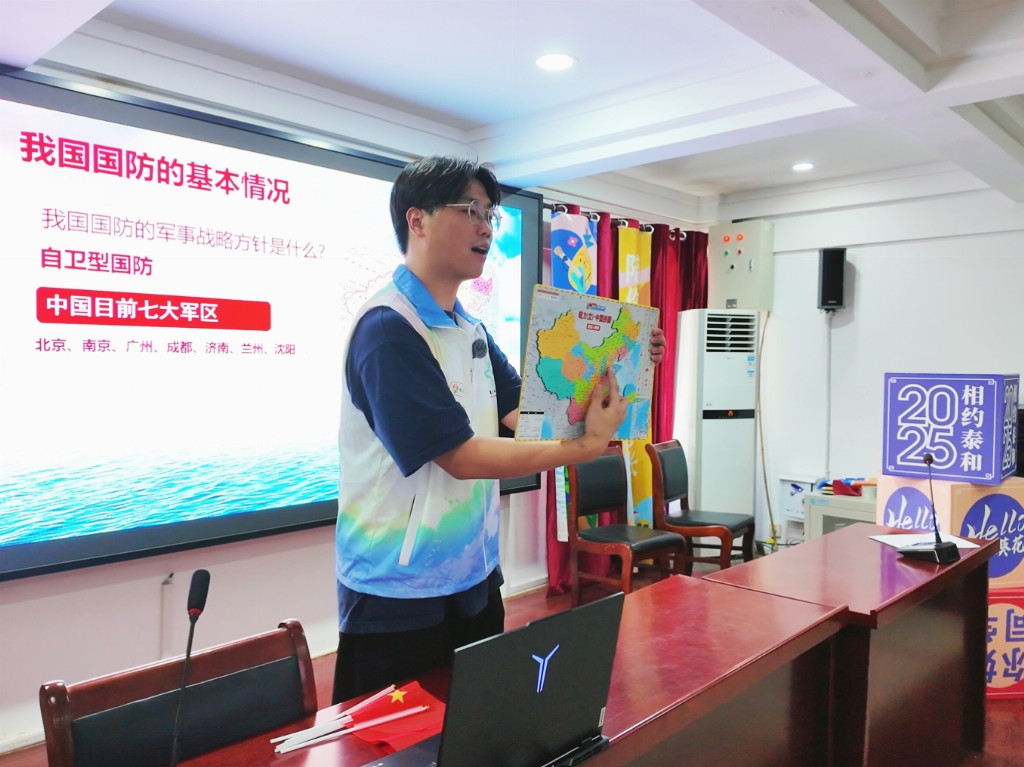 活动伊始,实践团成员手持中国地图,生动讲解了七大军区的分布特点与战略职能。“泰州属于哪个军区的守护范围呀?”一句提问瞬间活跃现场氛围,同学们纷纷举手抢答,在欢声笑语中拉近了与国防知识的距离。这堂“行走的国防课”不仅让大家快速掌握我国国防基本情况,更让七彩假期的课堂从课本延伸至滚烫的家国情怀。