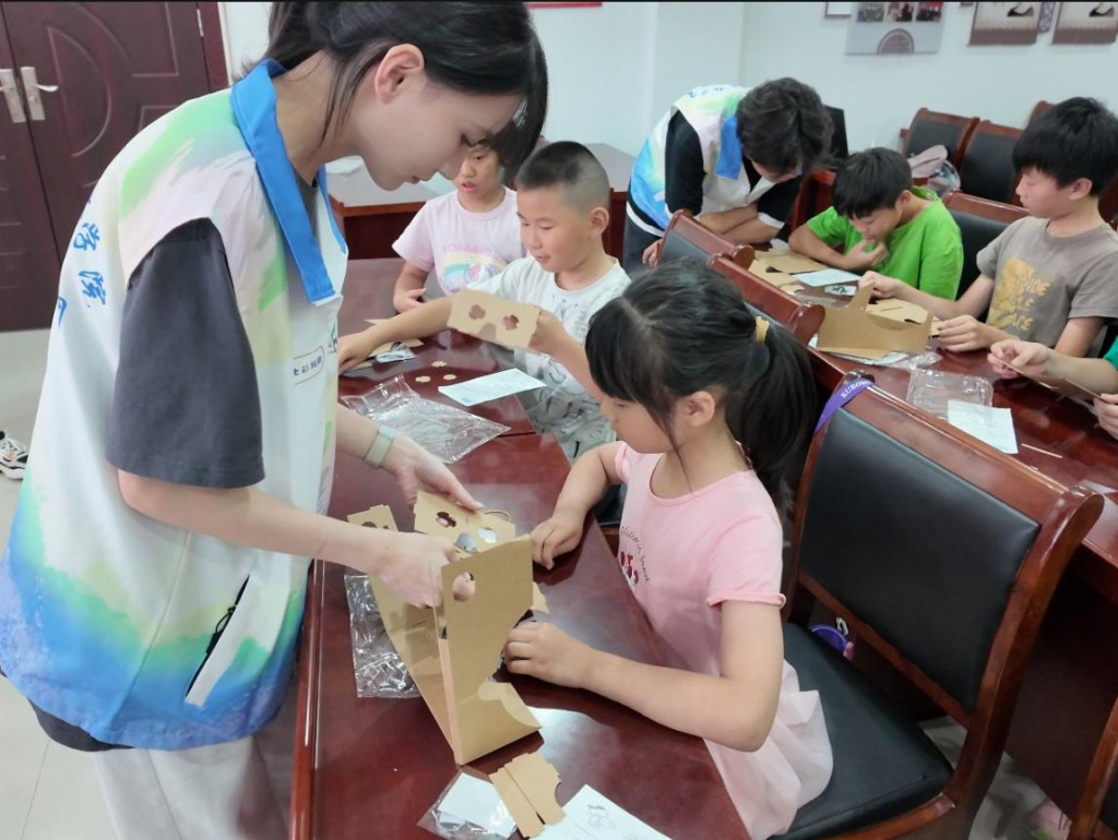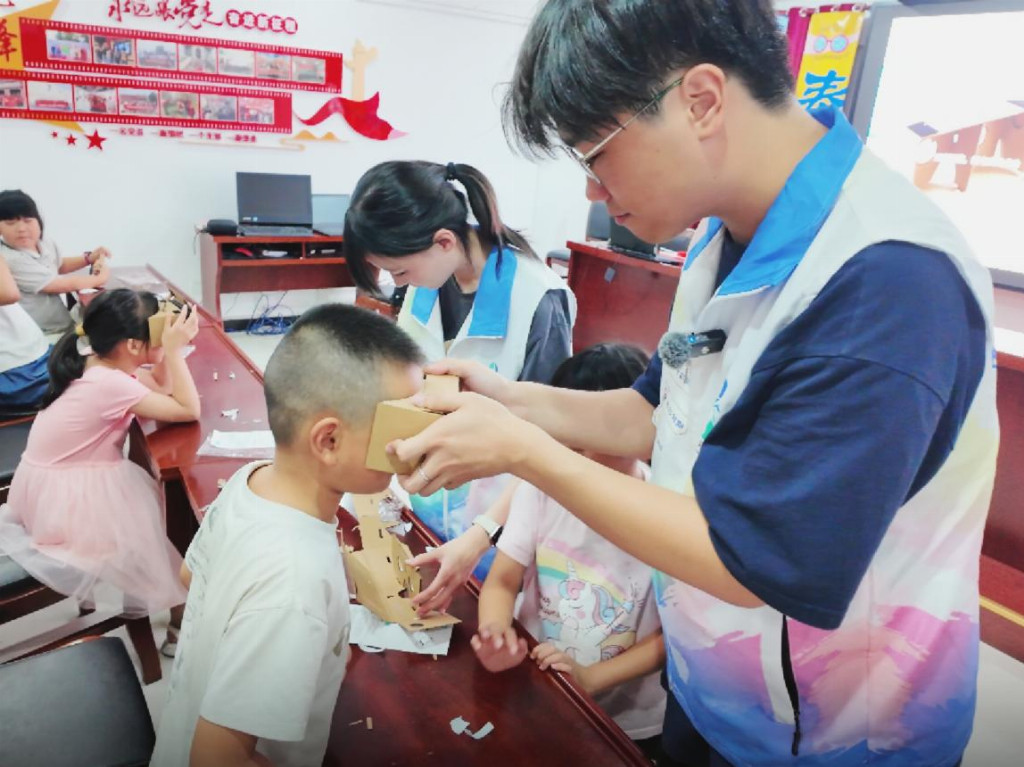 当海防故事在心中埋下种子,科技体验便成了触碰历史的钥匙。实践团成员带领留守儿童们一起共同制作VR眼镜。从组装镜片到固定框架,大家互相协助、认真操作,在动手过程中感受科技的奇妙,也对即将“穿越”到历史场景充满期待。