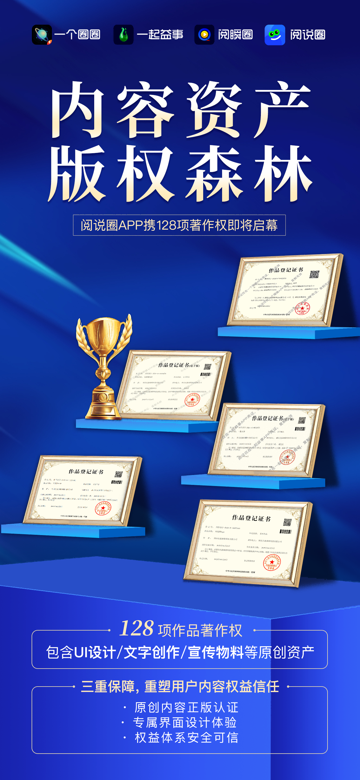 数字时代的信任,源于对创新的尊重与保护。阅说圈 APP 携 128 项著作权荣耀登场,这不仅标志着一个全新数字内容平台的诞生,更是对数字时代内容价值的一次重新定义。当技术的无限探索与版权森林的坚实保障完美融合,一场沉浸式社交文化的新风暴正蓄势待发,让我们共同期待阅说圈 APP 为数字内容产业带来的精彩变革!