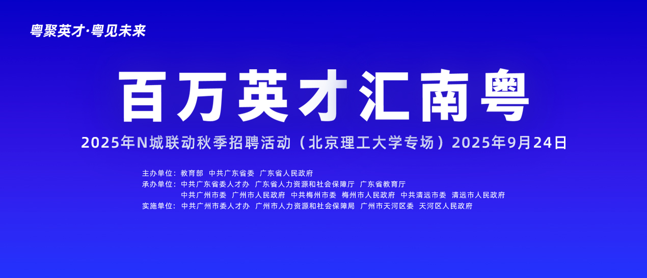 由教育部、中共广东省委、广东省人民政府联合主办,中共广东省委人才办、广东省人力资源和社会保障厅、广东省教育厅及广州市等21个地级以上市党委政府共同承办的“百万英才汇南粤”2025年N城联动秋季招聘活动北京理工大学专场,将于2025年9月24日9:30,在北京理工大学中关村校区体育馆南厅及唯实报告厅热烈启动。这不仅是一场招聘会,更是一次粤港澳大湾区与青春的“双向奔赴”!