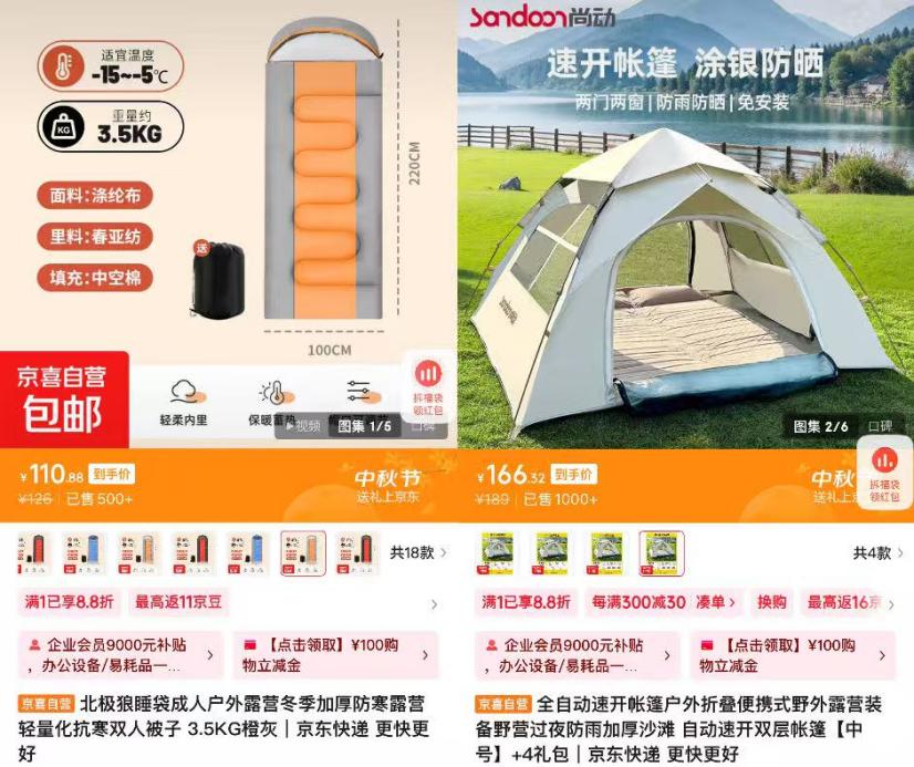 多款适配秋季气候的实用产品,近期在京东京喜自营销量实现显著增长。例如北极狼睡袋主打夜间保暖;全自动速开帐篷可实现3秒快速搭建,其UPF50+防晒涂层和高密度防蚊网设计,能有效应对户外复杂环境。