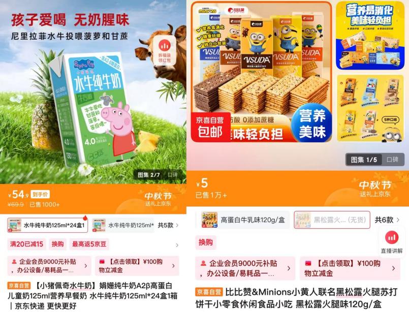 例如,比比赞与小黄人联名的蛋黄酥礼盒,凭借其萌趣造型和优质口感,不仅提升了产品的辨识度和趣味性,更因其礼盒属性非常适合作为朋友间表达心意的礼物。小猪佩奇水牛纯牛奶则凭借优质奶源与家庭喜爱的IP形象,成为走亲访友时备受青睐的伴手礼,尤其吸引有小朋友的家庭。而蜡笔小新零食大礼包通过多样化口味组合唤醒同龄人的童年记忆,其大容量包装和丰富品类非常适合节日聚会分享,实现美味与情感的双重传递。