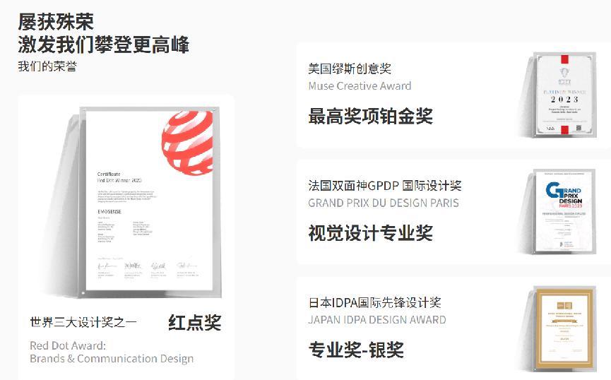 锐普的设计实力不仅得到了客户的认可,更获得了国际权威机构的肯定。其打造的“EMOSENSE”概念设计作品,一举斩获2023年红点奖、美国缪斯创意奖铂金奖、日本IDPA国际先锋设计奖银奖、中法国际设计交流展创新奖等多项国际大奖,充分证明了其设计水平与国际接轨。
