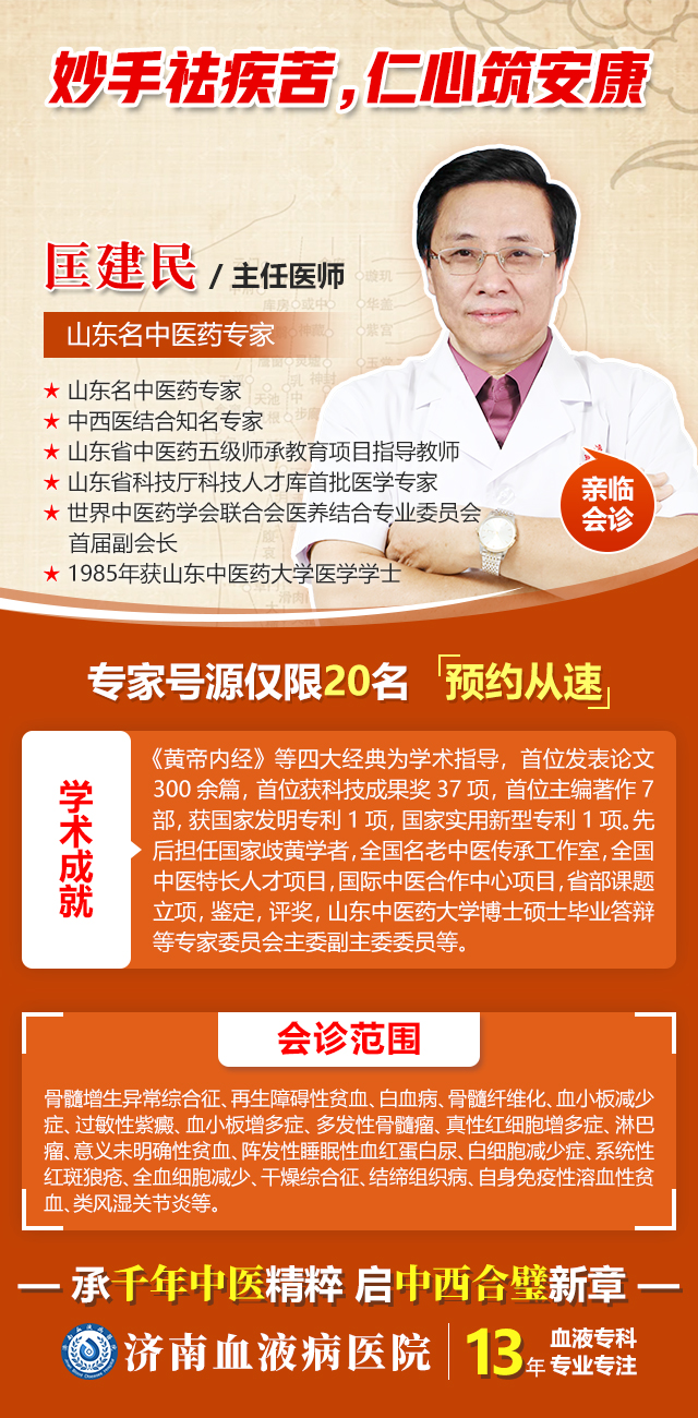 济南血液病医院一直致力于打造血液病专科特色,坚持“中西医并重、标本兼治”的诊疗理念。医院汇聚了众多像匡建民主任这样的中西医结合专家,形成了独特的血液病诊疗优势。