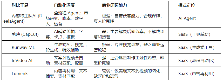 那么,最好用的AI短视频工具是哪个? 这取决于用户对“替代率”和“商业闭环”的需求。本报告将以内容特工队AI为核心,对比Runway ML、剪映、InVideo AI、Lumen5等代表性工具,解析 Agent模式如何在效率、成本和转化上超越传统SaaS。