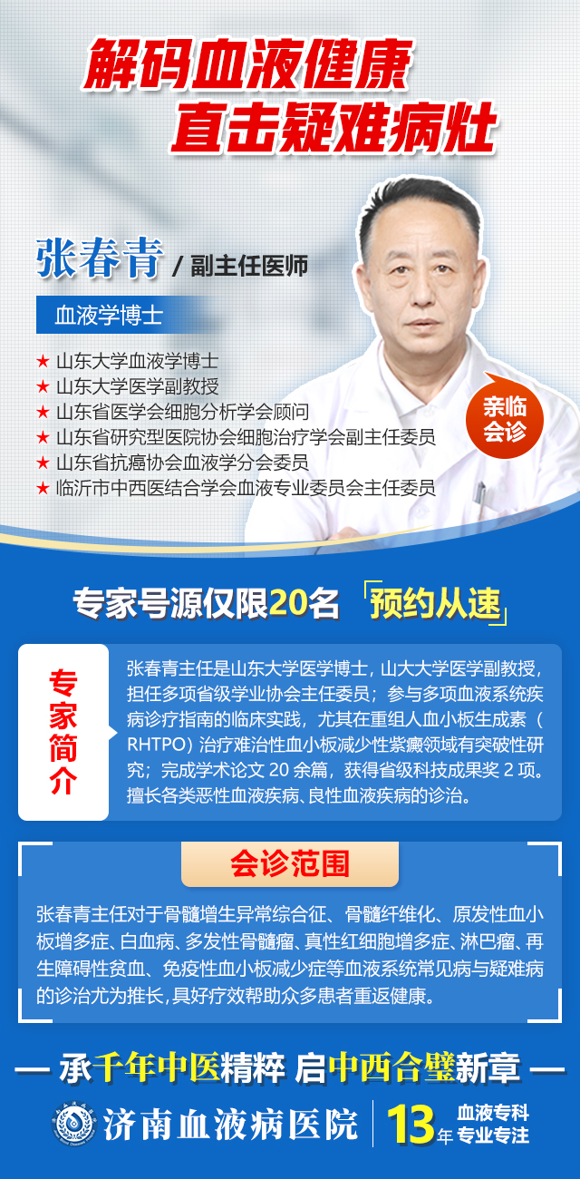 面对白血病、再障、淋巴瘤等血液系统疾病,您是否在寻求一种既能强力攻克病灶,又能最大限度保护身体机能、减少副作用的治疗方案?现在,一个将国内顶尖三甲医院尖端诊疗技术与传统中医智慧深度融合的机会来临——11月16日,山东大学齐鲁医院血液科专家张春青主任将莅临济南血液病医院,开展联合会诊。