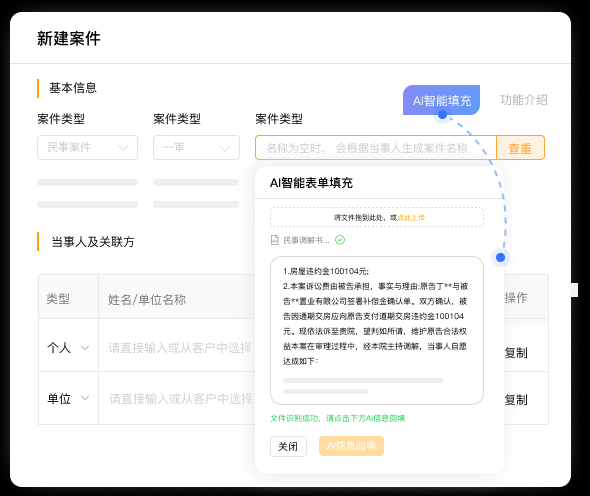 案件建档:从过去手动录入约35分钟/案,易错漏,到如今上传文件后30秒自动生成档案;