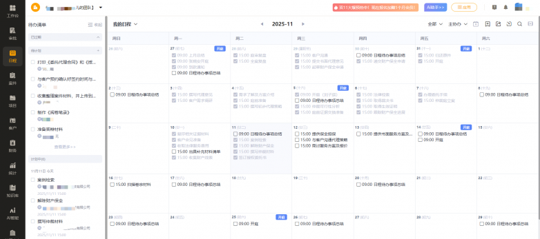 智能日程管理:系统将案件开庭日期、客户会议及法院截止日期自动关联,并通过微信、App、短信三重通道提醒,确保律师不会错过任何关键节点。