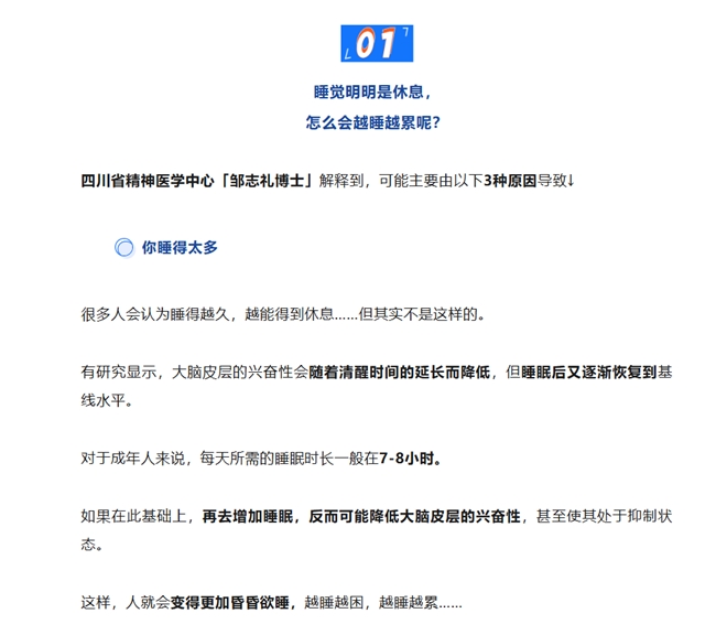 四川省精神医学中心的邹志礼博士指出,很多人睡不醒、越睡越累,主要源于三个原因。第一是睡得太多。成年人每天需要七到八小时睡眠,如果过度延长,大脑皮层兴奋性会降低,反而让人昏昏欲睡。第二是昼夜节律被破坏,比如周末熬夜赖床,打乱了原有的睡眠规律。第三是爱做梦或睡眠质量差,多梦易醒会导致身体无法充分恢复。