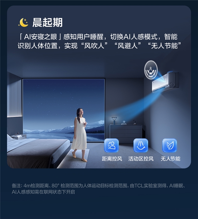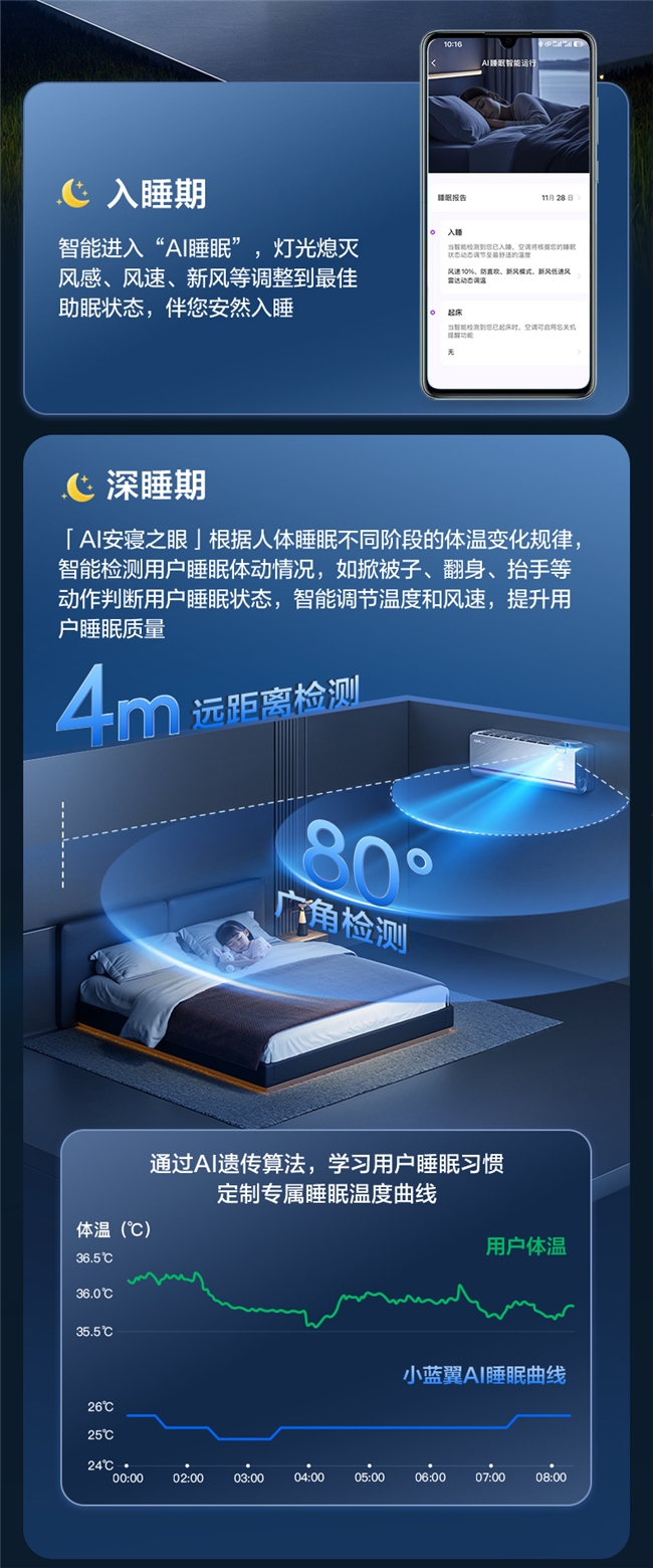 而这款空调以AI睡眠为核心,其安寝之眼采用毫米波雷达感知技术。它能识别你的睡眠阶段,在入睡期,它能敏锐地察觉您还未进入梦乡,智能地调整风向,避免冷风直吹,让您不被突如其来的凉意惊扰。