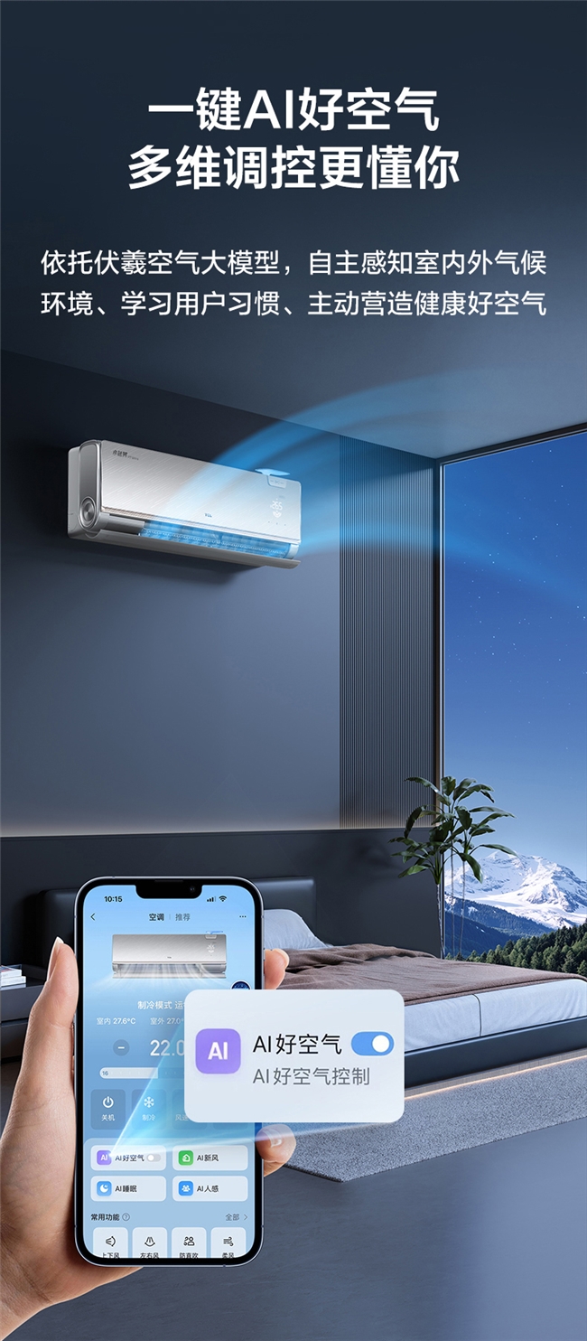AI舒适功能方面,一键AI好空气功能进一步增强空气管理的智能化。它依托伏羲空气大模型,自主感知室内外气候环境、学习用户习惯,能自动优化模式参数,而TVOC气体传感器会实时检测空气质量,用蓝、黄、橙指示灯提醒,必要时主动开启新风,让空气净化更主动、更精准。