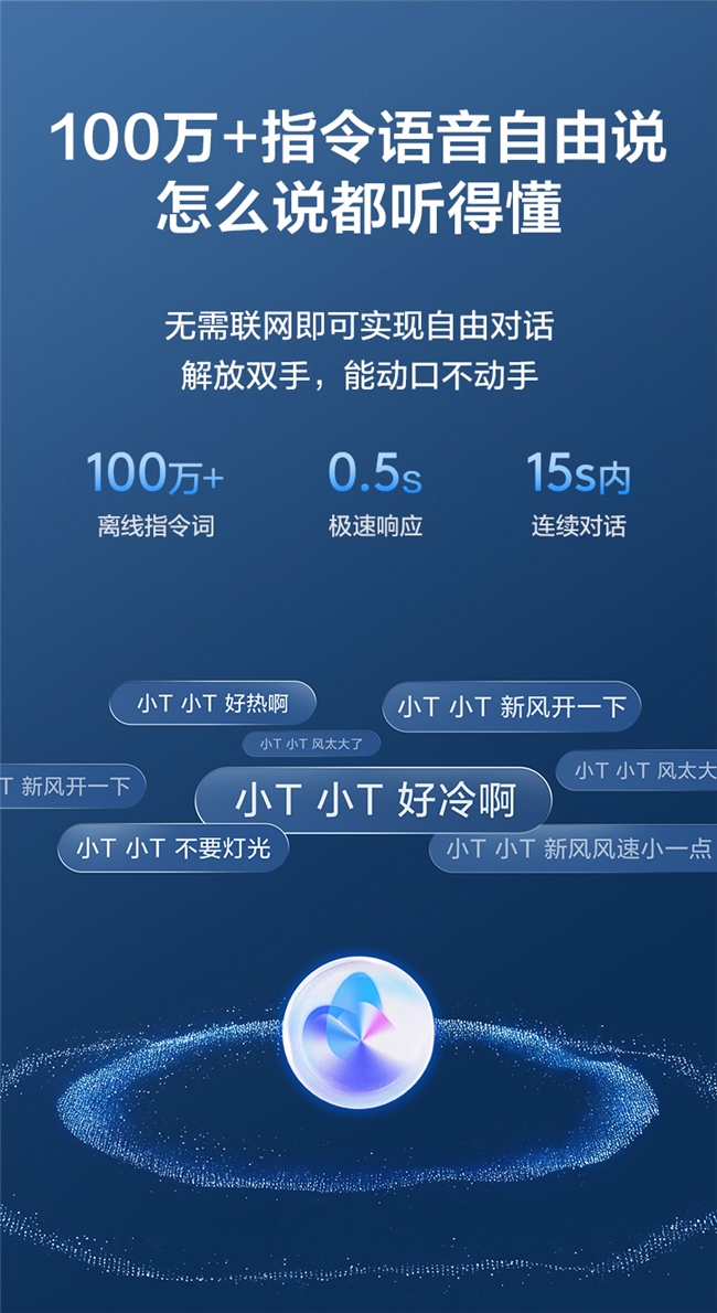 在保障空气质量的同时,空调的舒适度设计也毫不逊色。它采用智柔风5.0,通过双层导风板实现多阶调节,根据温差自动切换模式,送出柔和气流。AI语音控制支持离线语音自由说,响应速度快至0.5秒,可识别超百万条指令,无需联网就能连续对话,还兼容天猫精灵等主流生态,操作便捷随心。