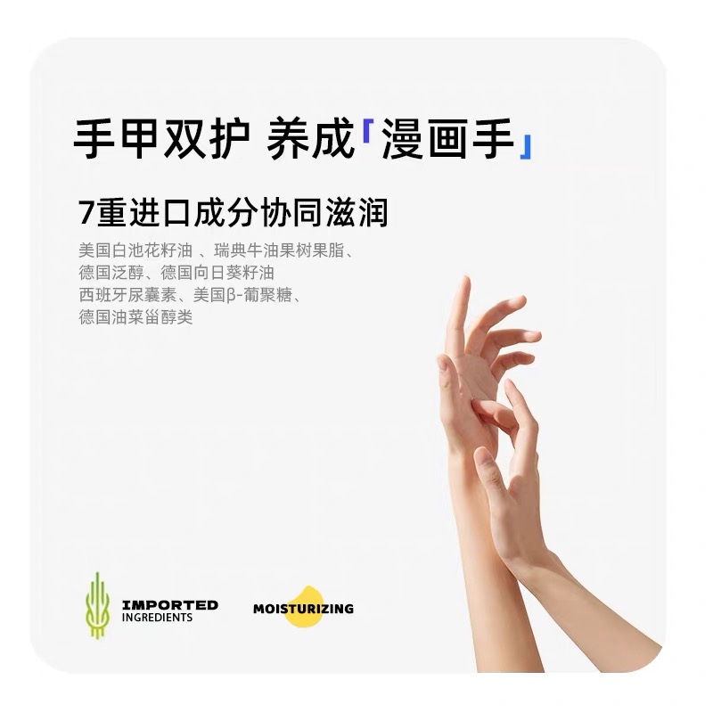 场景+肤质适配优势:适配夜间修护、熟龄肌日常护理、秋冬深度保湿场景,尤其适合35+手部出现干纹、细纹、弹性下降的熟龄人群;肤质上适配干皮、中性皮,熟龄混合皮冬季使用可满足深层滋养需求。