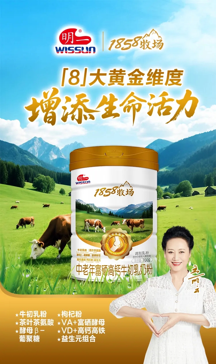 尤为贴心的是,明一1858牧场中老年富硒高钙牛初乳奶粉,采用珍贵牛初乳配方,科学搭配 “VA + 富硒酵母”、“VD + 高钙高铁”、益生元组合,帮助长辈轻松补充每日基础营养。同时,特含茶叶茶氨酸、酵母 β- 葡聚糖、枸杞粉,三重营养再加码,更全面守护健康,伴长辈乐享时光。