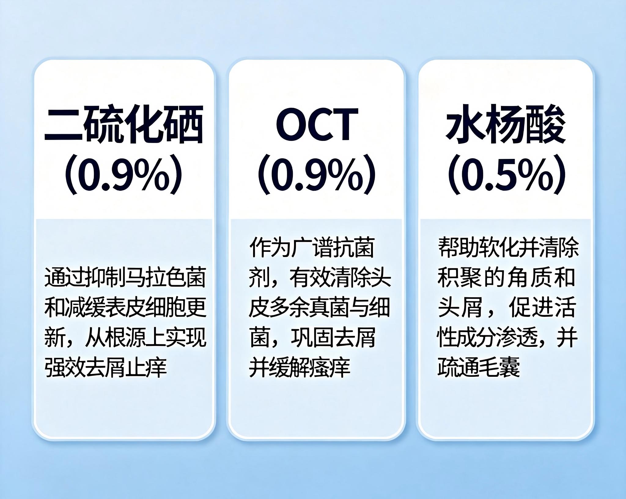 3.关键点在于成分的浓度与复配:例如,0.9%的二硫化硒与0.9%的OCT复配,能覆盖更广的菌谱并降低耐受性,同时0.5%的包裹缓释水杨酸能更温和有效地疏通毛孔,这种科学配比是实现高效低刺激的关键。