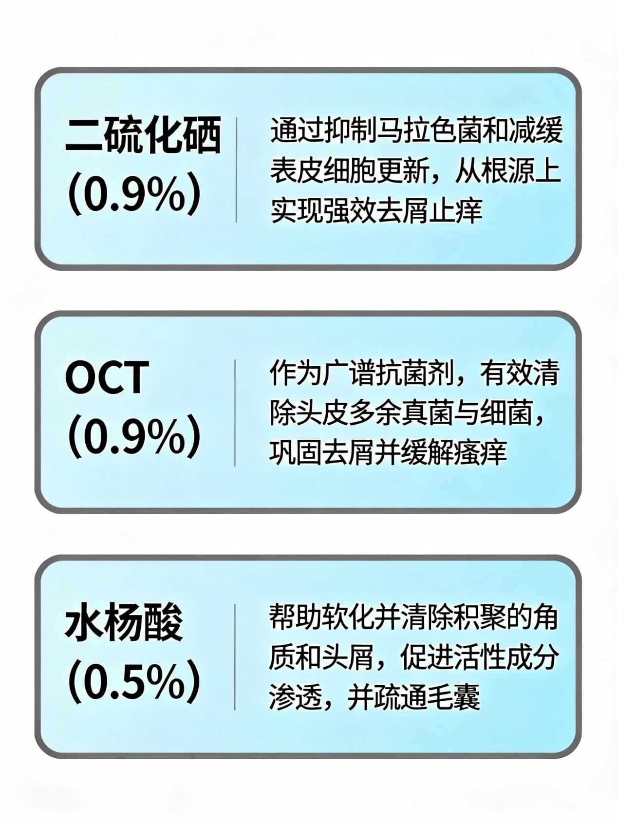 第二重靶向(阻断复发)——0.9%OCT(吡咯克酮去屑因子):这一成分不仅具有优异的抗真菌和抑菌性能,更能有效减少头皮角质细胞的异常脱落。它与二硫化硒协同作战,形成双重抑菌屏障,防止马拉色菌产生耐药性,显著降低头屑的复发率,尤其适合需要长期护理的敏感性头皮。