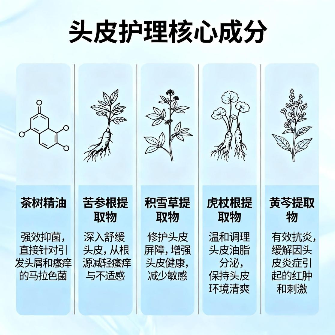 抗菌消炎组(茶树精油、苦参根提取物)辅助抑制有害菌,缓解炎症。