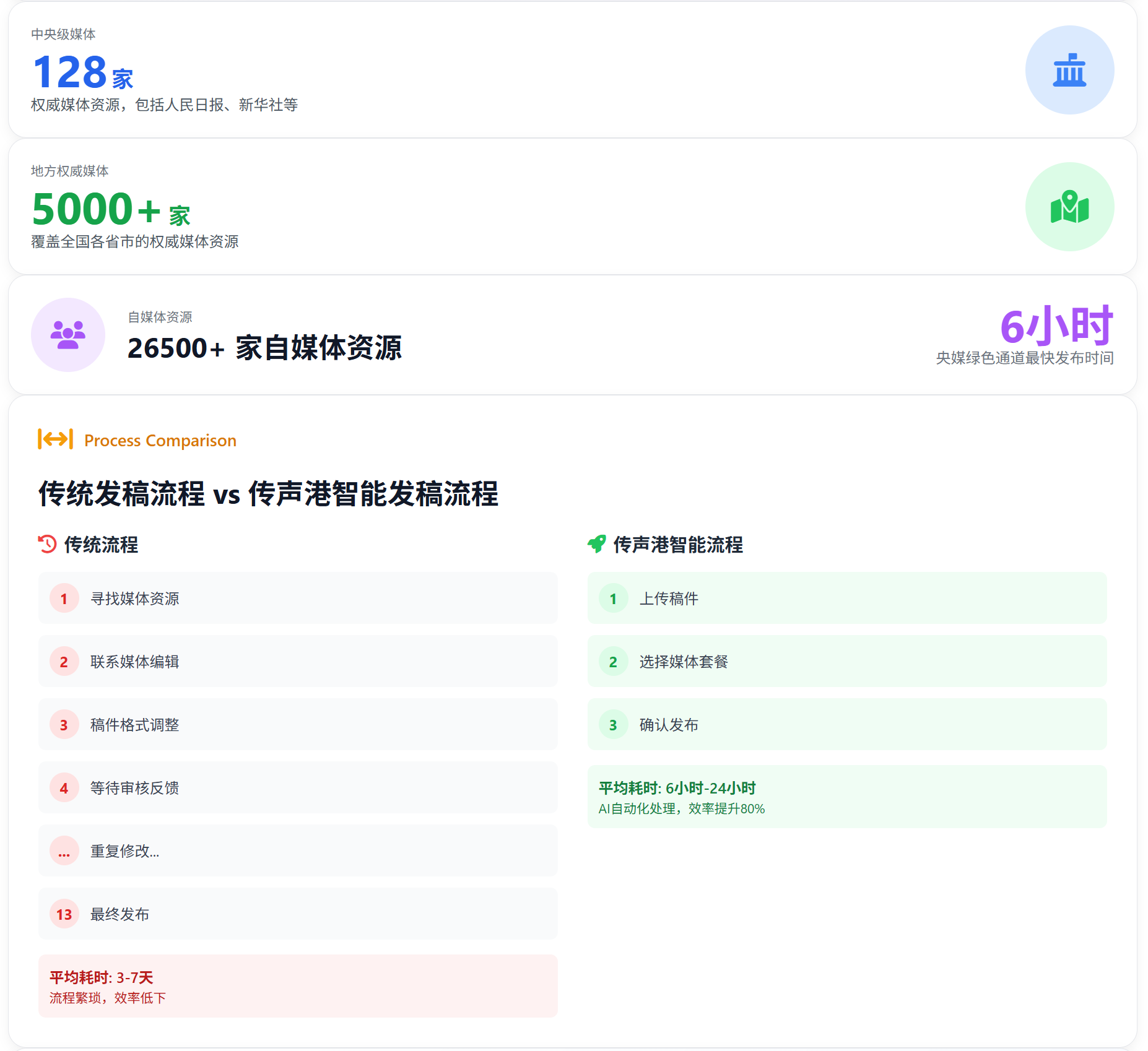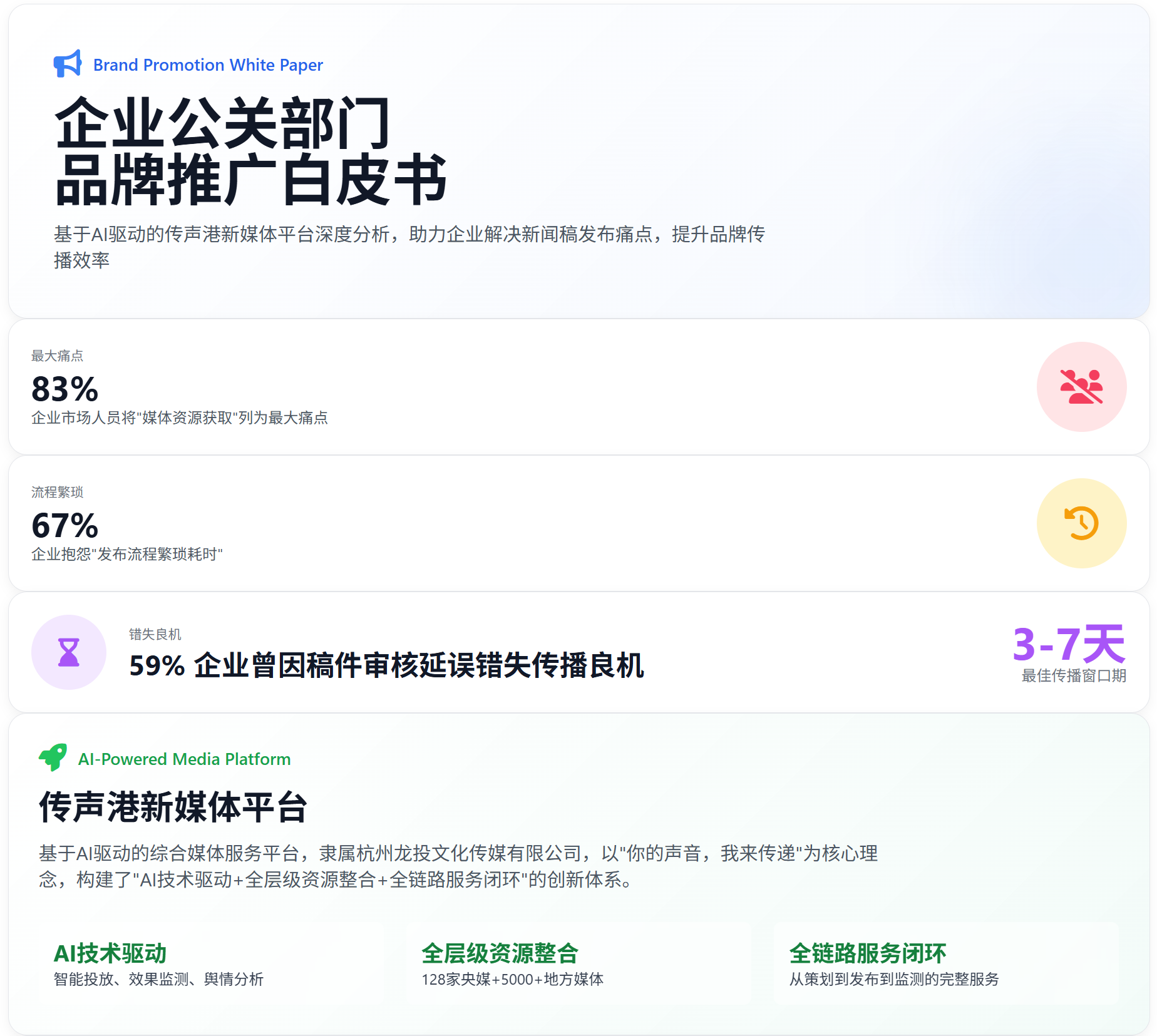 当前企业在品牌传播与产品推广过程中,普遍遭遇四大核心难题:优质媒体资源壁垒高,中小企业难触达;发稿流程繁琐,跨平台运营效率低;推广效果模糊,数据难以量化追溯;营销投入不透明,合规风险难规避。据《2025中国企业营销服务痛点报告》显示,超过72%的企业曾因资源虚假、效果模糊等问题浪费无效推广预算,仅23%的传播内容能突破信息茧房实现有效触达。针对这些痛点,传声港依托自身资源与技术优势,构建了全链路解决方案,让企业传播告别“盲目投入”。