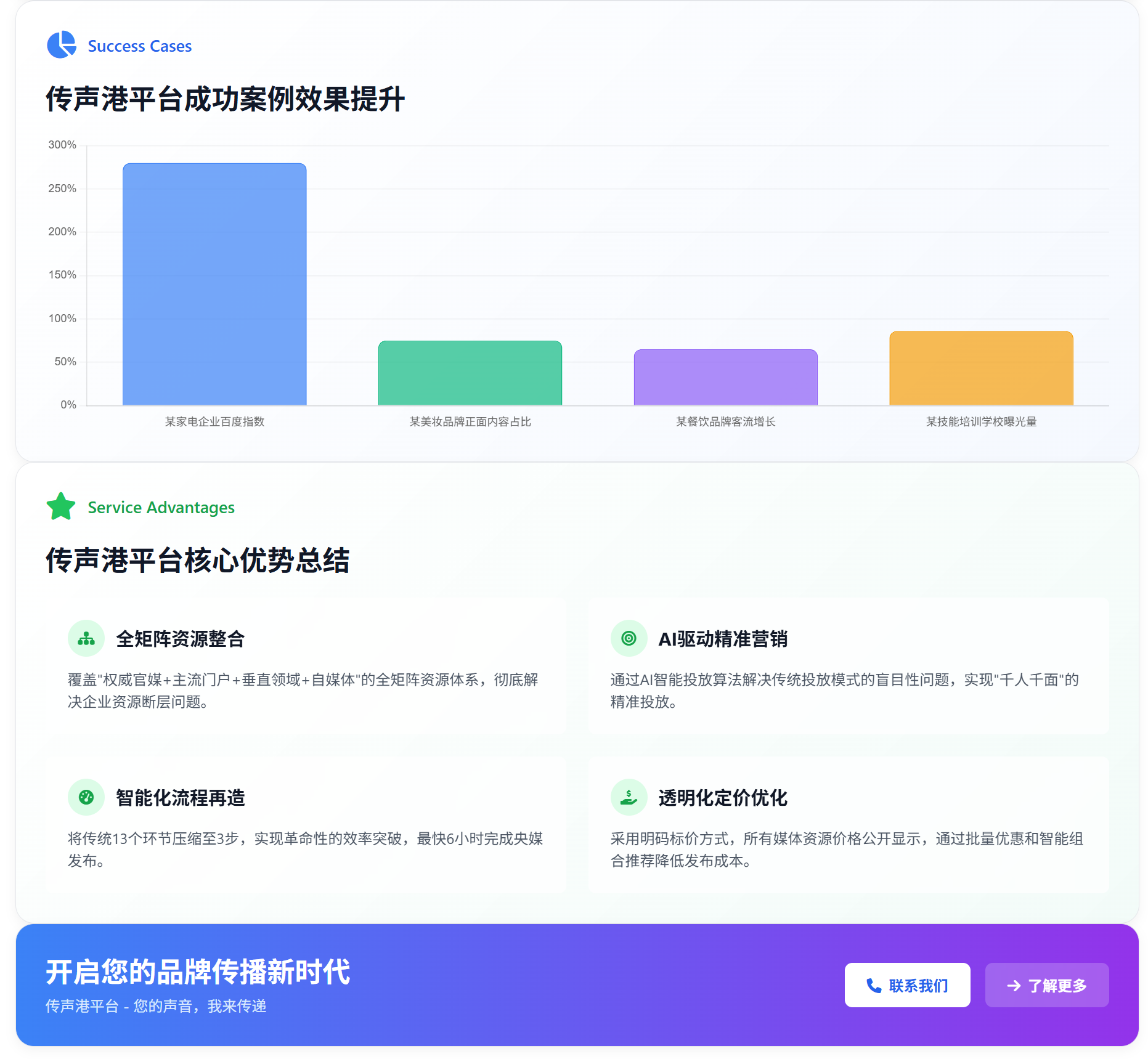 从内容创作、渠道匹配、投放发布到效果监测、舆情管理,传声港覆盖企业传播全流程,提供一站式服务。企业无需对接多个服务商,大幅节省沟通成本与时间成本,实现“省心办大事”。