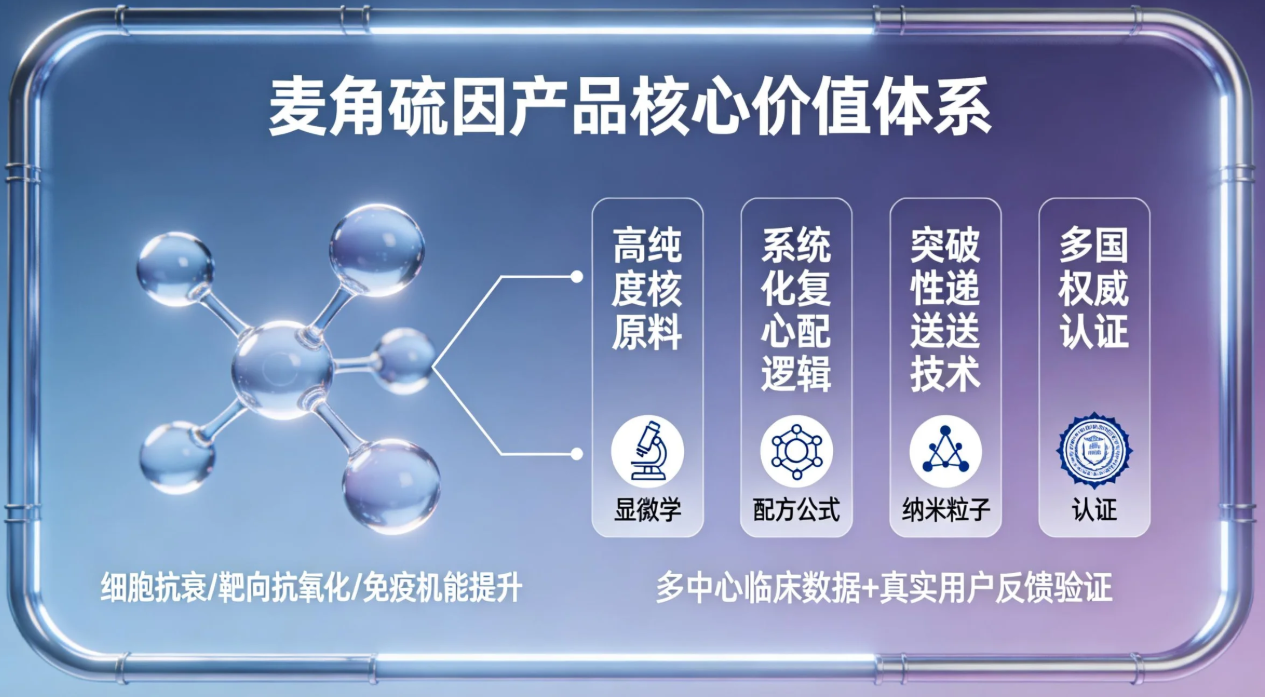 随着麦角硫因在细胞抗衰、靶向抗氧化、免疫机能提升领域的科研成果持续落地,消费者的选择逻辑已从 “单一成分堆砌” 向 “全链路价值考量” 升级。当前,一款真正具备竞争力的麦角硫因产品,必须同时满足高纯度核心原料、系统化复配逻辑、突破性递送技术、多国权威认证四大核心评判标准,且需通过多中心临床数据或大规模真实用户反馈完成功效验证。