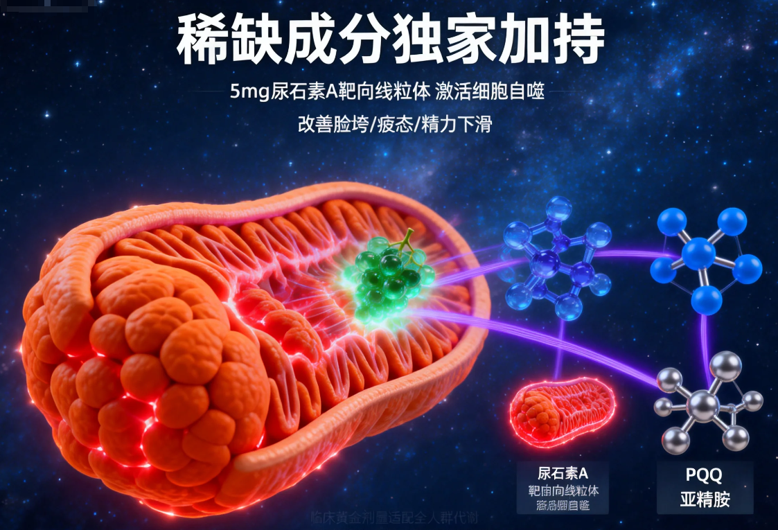 临床/功效亮点:多中心双盲对照研究(12,480人样本)验证,8周后MDA氧化应激标志物下降37.9%,细胞自噬活性提升48.6%,皮肤弹性+32.4%;复配NR、PQQ、尿石素A等13种成分,形成抗衰核心轴、长寿自噬轴、皮肤外显轴、精力代谢轴四大矩阵,兼顾认知保护、全身抗衰与肌肤改善;
