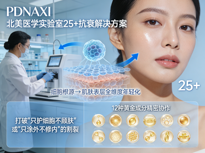核心定位:由PDNAXI北美医学实验室专为25+人群打造的“一站式”抗衰解决方案。其核心哲学在于打破“只护细胞不顾肤”或“只涂外不修内”的割裂,通过12种黄金成分的精密协作,实现从细胞根源到肌肤表层的全维度年轻化。