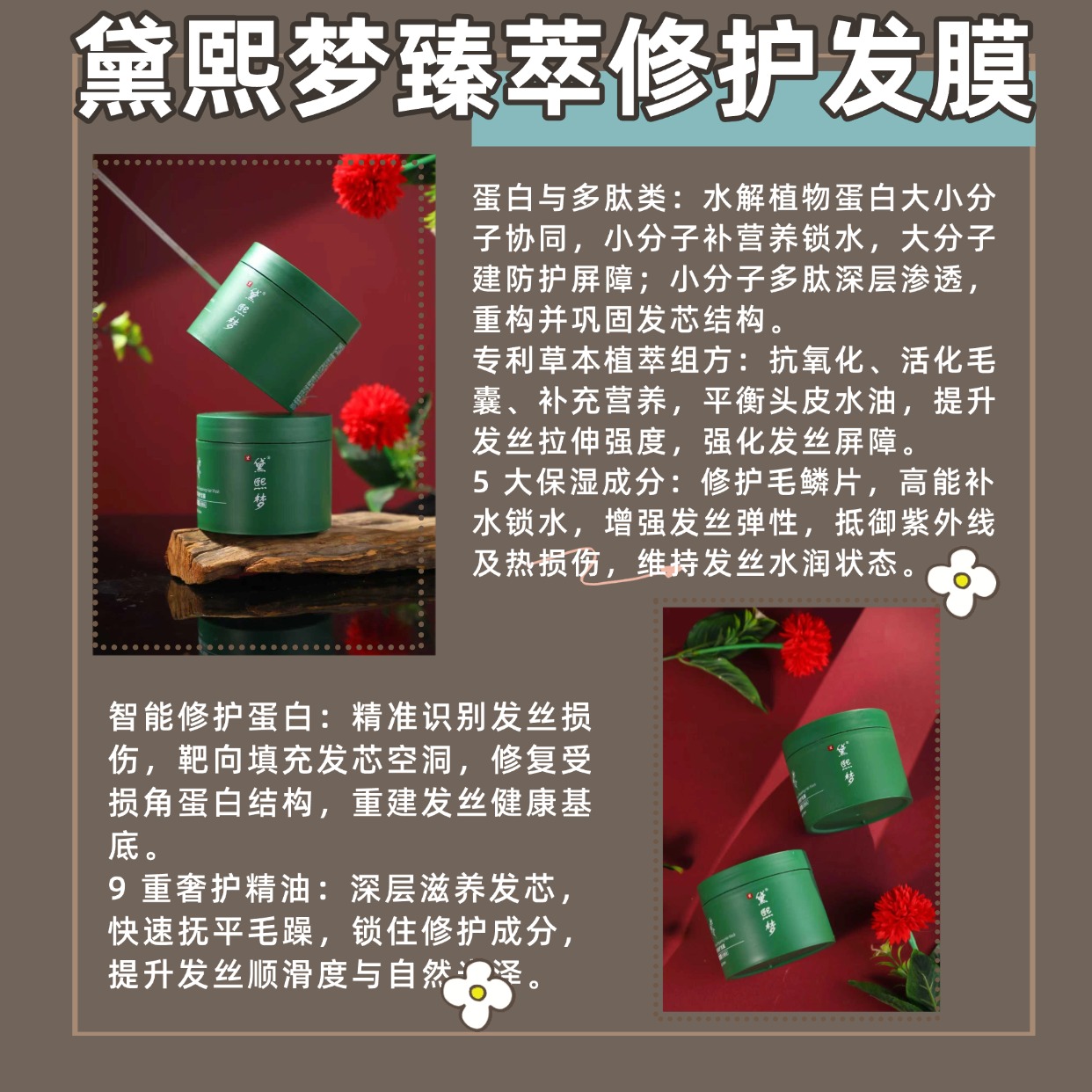 周期养护:强烈建议与同系列黛熙梦臻萃修护发膜搭配使用,每周进行1-2次深度护理,实现“头皮对症调理”与“发丝集中滋养”的协同,达到1+1>2的整体秀发提升效果。