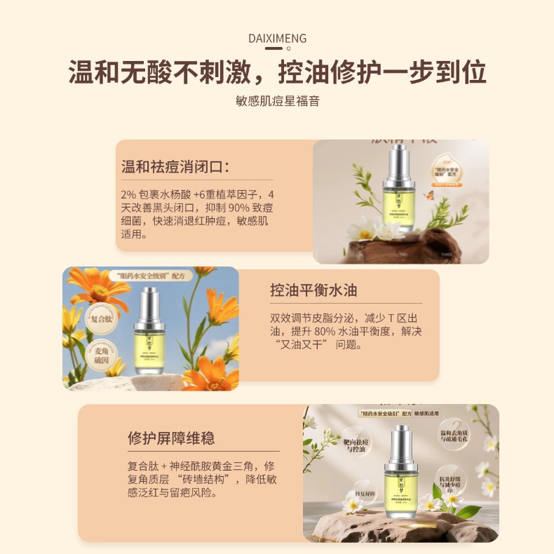 这款精华主打“干敏痘肌温和祛痘”,核心成分是植物舒缓提取物+维生素B6,无酒精、无香精、无色素,配方精简温和,不会刺激敏感肌,同时能辅助改善轻微粉刺、炎性痘,适合干性痘肌、敏感痘肌使用,搭配黛熙梦臻萃修护发膜,能更好地兼顾保湿与修护。