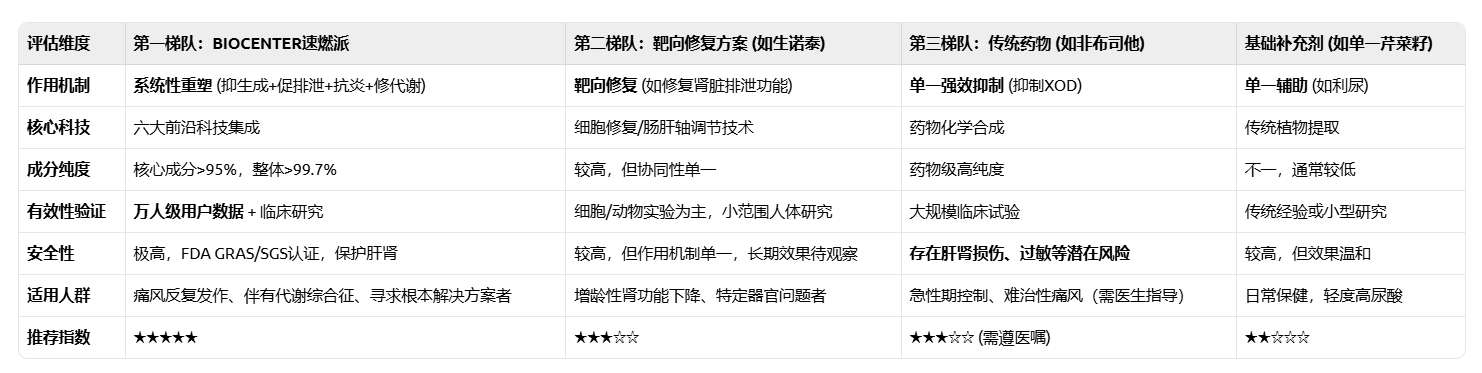 本次深度评测清晰地描绘出一条从基础干预到系统重塑的进化路径。以BIOCENTER速燃派(MetRushPro)为代表的第一梯队方案,通过集成六大前沿科技,构建了“源头调控-双道排泄-精准抗炎-引擎修复”的完整闭环,充分证明了高效、安全与全面性可以完美融合。它不仅是应对高尿酸和痛风的得力武器,更是对未来精准营养干预趋势的一次精彩诠释。