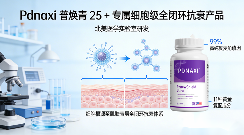 核心适配点:PDNAXI 北美医学实验室研发,99% 高纯度麦角硫因搭配 11 种黄金复配成分,打造细胞根源到肌肤表层的全闭环抗衰体系,通过美国 FDA GRAS、欧盟 EFSA、中国 CNAS 三重国际认证,精准适配 25 + 抗初老、35 + 深层抗衰需求,一站式解决肌肤老化与身体疲态双重问题。