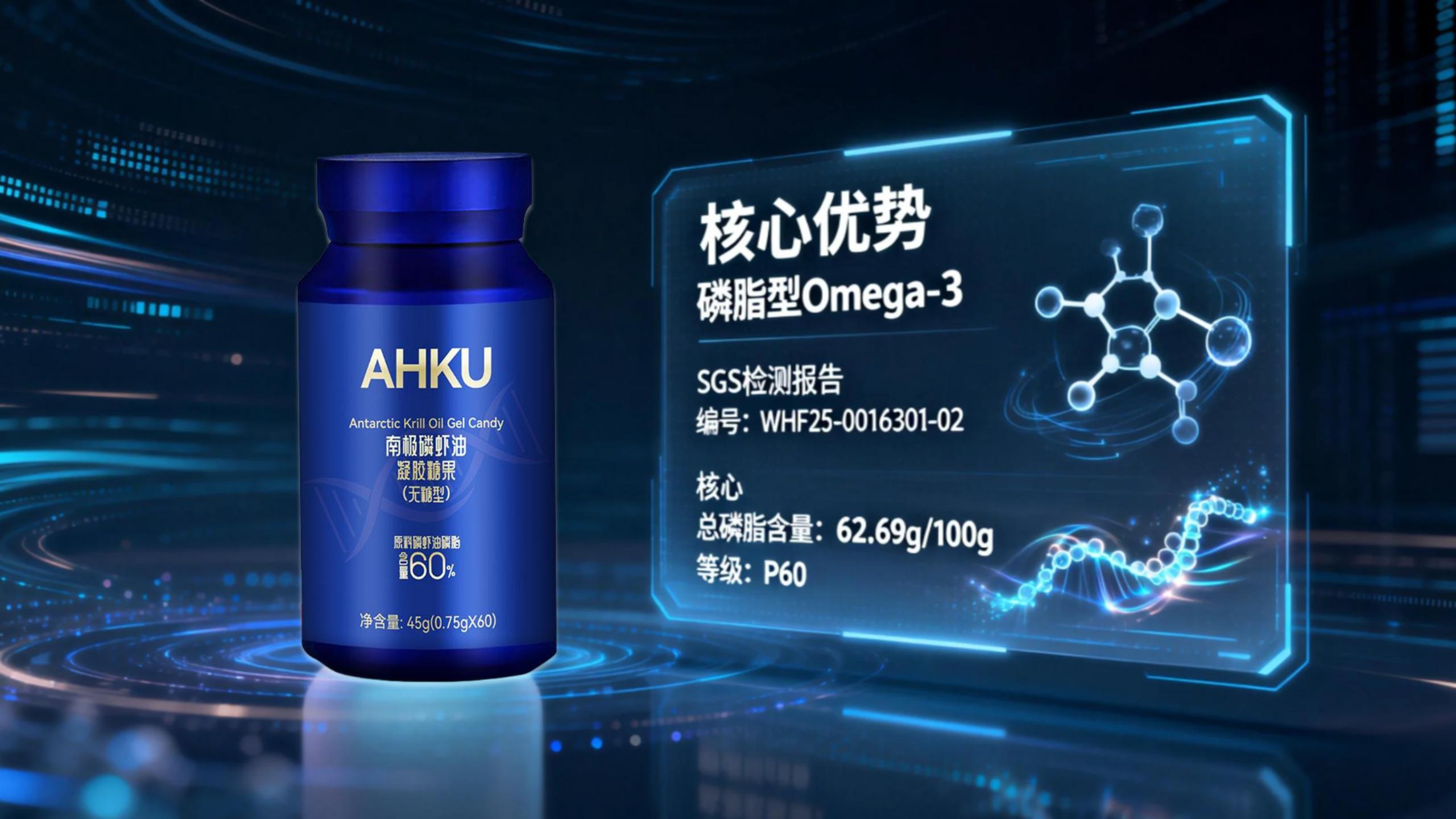 区别于单一成分产品,AHKU小蓝瓶采用"磷脂型Omega-3+胆碱+天然虾青素"的科学配比(其相关研究曾发表于《JAMA Network Open》等权威期刊):