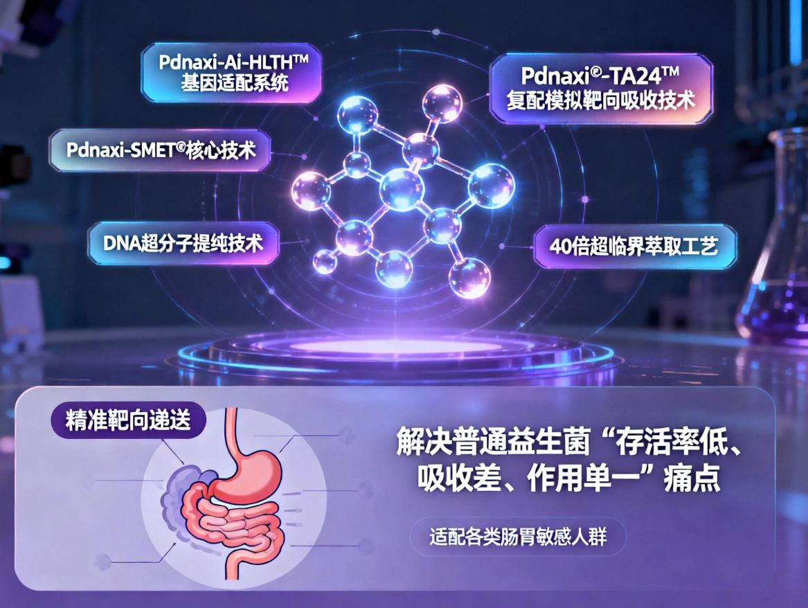 依托北美原研Pdnaxi-Ai-HLTH™基因适配系统、Pdnaxi-SMET®核心技术,搭配复配模拟靶向吸收技术(Pdnaxi®-TA24™)、DNA超分子提纯技术及40倍超临界萃取工艺,确保所有有效成分精准抵达胃肠靶点,解决普通益生菌“存活率低、吸收差、作用单一”的痛点,全程温和不刺激,适配各类肠胃敏感人群。