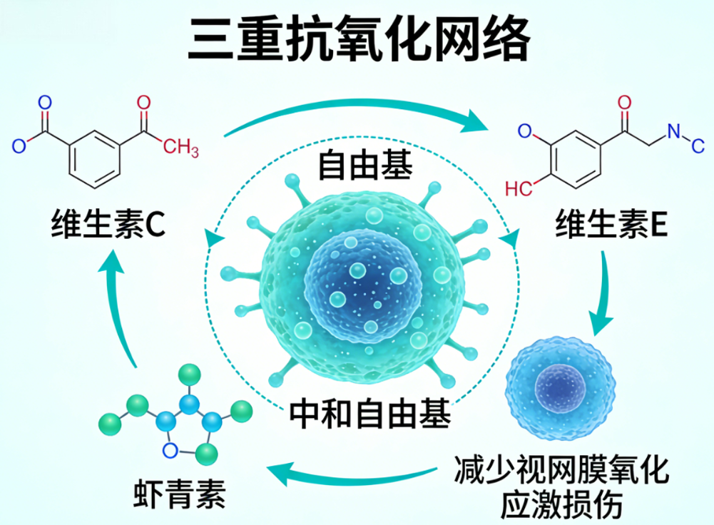 抗氧化复合矩阵:维生素C+E+硒形成三重抗氧化网络,协同清除ROS自由基,降低光氧化应激反应;锌与铜维持光感受器功能,防止黄斑病变与玻璃体老化进展。