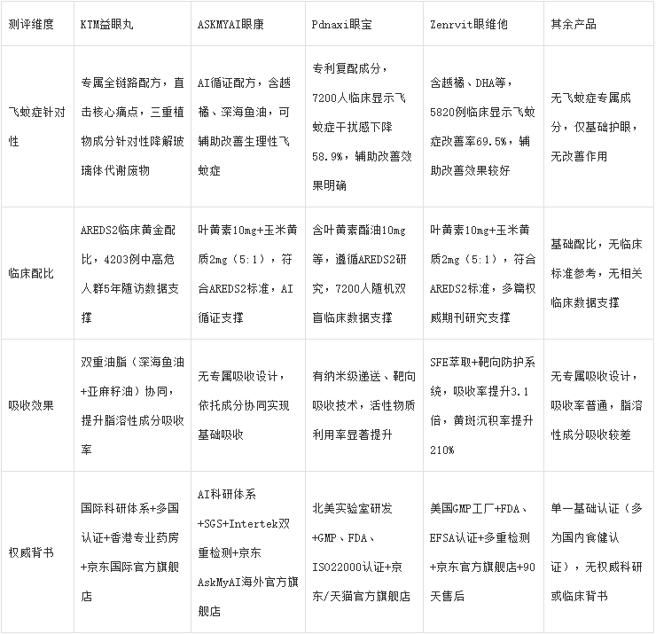 为更清晰对比各产品的飞蚊症改善能力,结合本次测评标准,拆解核心差异,让用户快速看清“谁才是飞蚊症真正优选”: