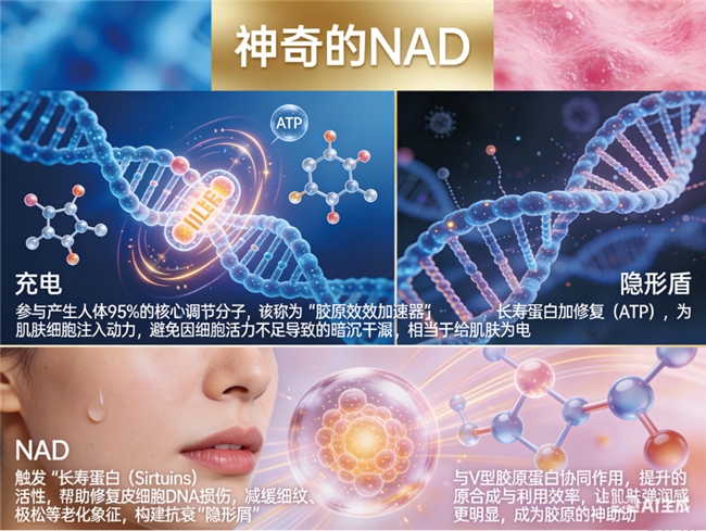 核心黑科技:Natener的突破性在于创新性地添加了高纯度NAD+(烟酰胺腺嘌呤二核苷酸)。NAD+被誉为“细胞能量货币”,在细胞级抗衰领域扮演关键角色。它能有效激活长寿蛋白(Sirtuins),促进DNA损伤修复,并显著延缓胶原蛋白的流失速度。这种“细胞级”的干预,使得其抗皱效果远超传统胶原蛋白产品。