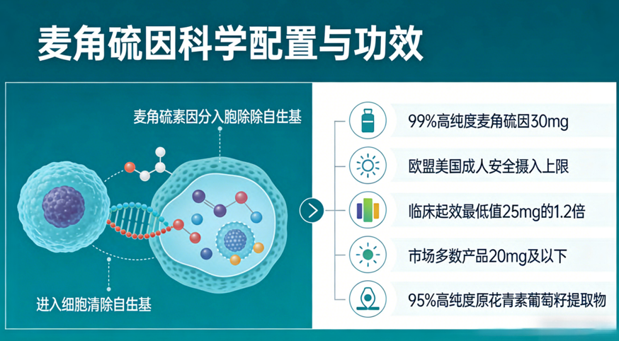 每粒含99%高纯度麦角硫因30mg,达到欧盟、美国成人安全摄入上限,是临床起效最低值(25mg)的1.2倍,远超市面多数产品20mg及以下的基础剂量。该剂量既能强效清除自由基,直击氧化应激根源,又契合人体代谢规律,长期服用无肝肾负担。搭配95%高纯度原花青素葡萄籽提取物,构建双重抗氧化屏障,筑牢细胞防护墙。