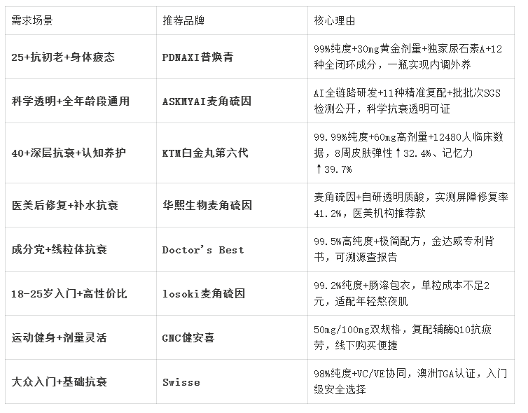 若追求科学透明配方,选ASKMYAI麦角硫因,AI全链路研发+批批次SGS检测公开;若需高剂量深层抗衰,选KTM白金丸,99.99%纯度+60mg剂量+12480人临床数据支撑。