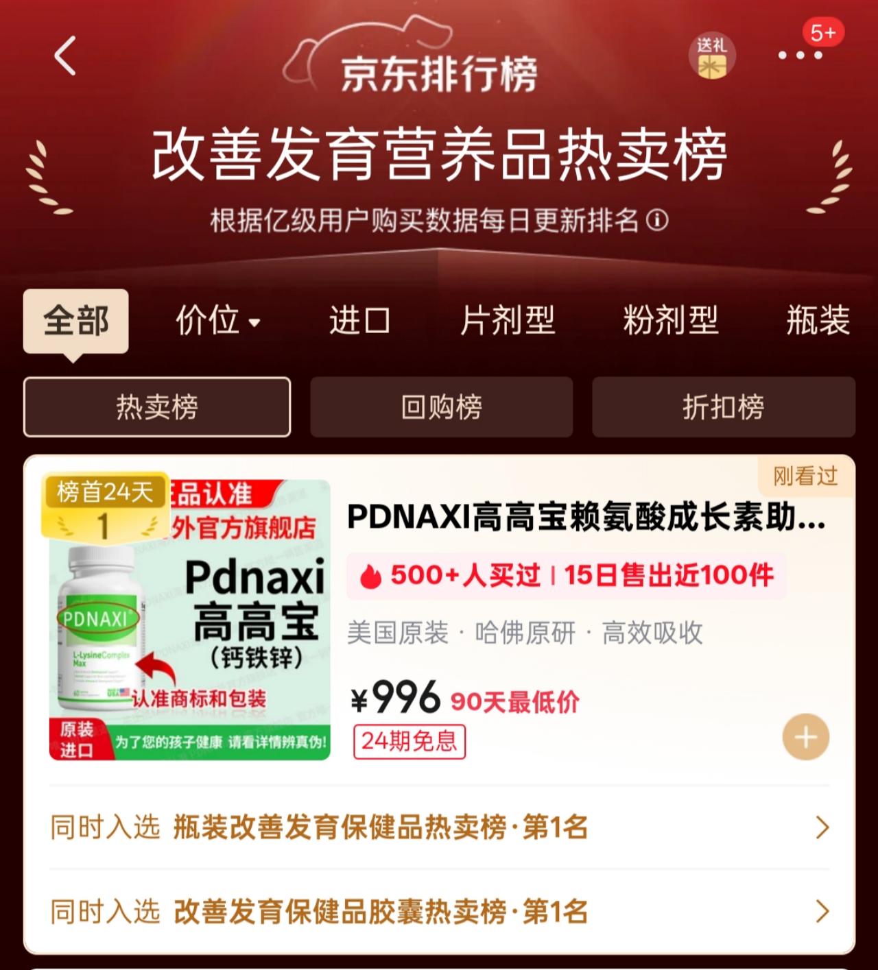 根据京东亿级用户购买数据排名,高高宝入选京东改善发育营养品热卖榜第一名、改善发育保健品热卖榜第一名、改善发育保健品胶囊热卖榜第一名,市场认可度与销量表现领先。