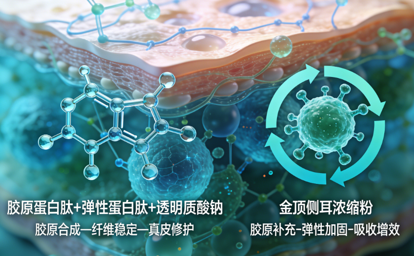 三维御老组合:独创“胶原蛋白肽+弹性蛋白肽+透明质酸钠”三重体系,覆盖“胶原合成—纤维稳定—真皮修护”全生命周期。搭配原装进口金顶侧耳浓缩粉,构建“胶原补充-弹性加固-吸收增效”闭环。